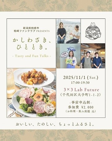 新潟県柏崎市は、首都圏で暮らす40歳までの人と柏崎との縁を深めるイベント「かしわざき、ひととき。」を、11月1日(土)17:00~19:30に、東京・大手町の「3×3 Lab Future」で開催する。