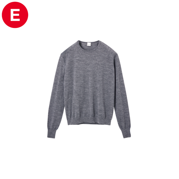 冬の着まわしアイテムとしてハズせないのが、超スタンダードなハイゲージのクルーネックニット。王道アイテムゆえ、とことん形にこだわって選ぶべし。グレーのチョイスも今季らしくて◎。ニット¥46,200(バウト/ボウト)