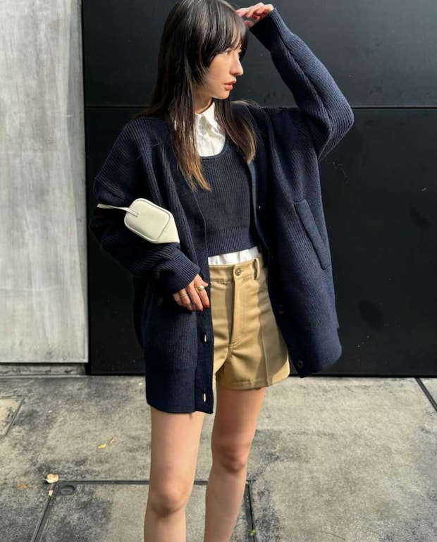 「オーバーサイズのカーディガンとクロップト丈ビスチェがセットになったアイテムをメインに、ショートパンツで足元をスッキリさせていつものこの時季とは違う新しいコーディネートに。シャツとバッグにホワイトを差し、足元はパンプスを合わせて、全体的に重い印象にならないように柔らかさも意識しました」