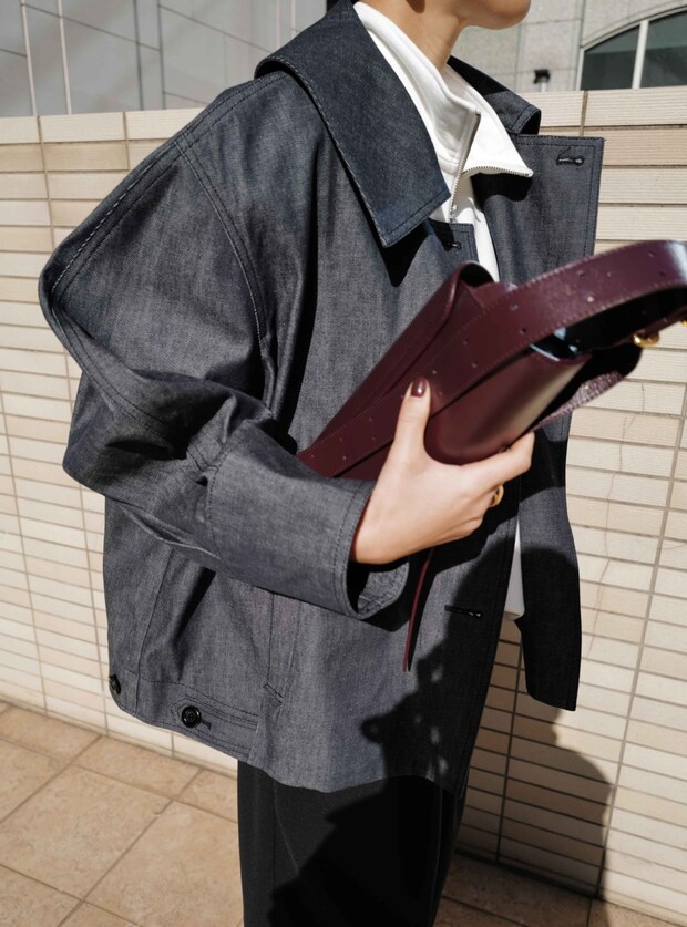「ラグジュアリーブランド向けに岡山で作られた高級感のあるデニムを使用したジャケット。やや大きめの襟やダブルボタンのバランスもよくアクセントに。バックヨークも付いているので後ろ姿も決まります。カジュアルなスエットとも相性◎」デニムジャケット¥33,000(マチャット)、JIL SANDERのバッグ、その他は本人私物