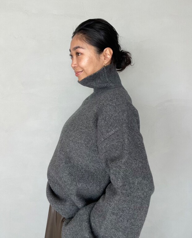 「ブランドで毎年好評の圧縮ニット。寒がりにとって冬のマストアイテムで毎シーズン違う色を購入しているほどのお気に入り。今季は新型でハイネックを作りました。あえてタートルにはせずにハイネックで首に沿うラインにしたところがポイント。風通しも少ないニットなのでマフラーいらずで冬を越せそうです」ハイネックニット¥15,400(シールームリン)