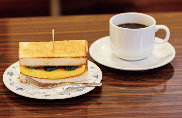 開店と同時に、「おはようさん」と常連客が訪れる祇園の喫茶店。きつね色にトーストしたパンで卵焼きとキュウリを挟んだこちらは、50年以上前から愛されている味。軽く食べられる量と程よい塩加減の卵焼きがちょっと食べ過ぎ気味の旅先での朝食にぴったり。