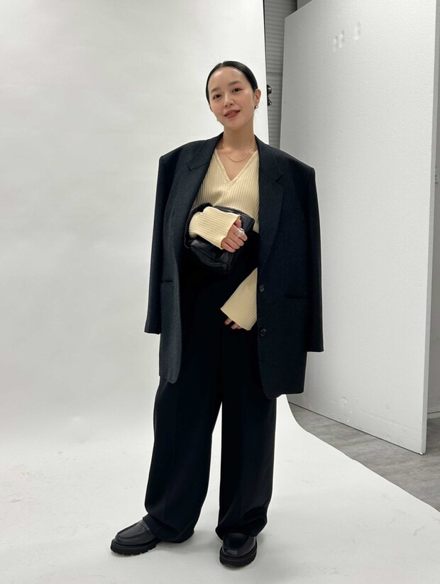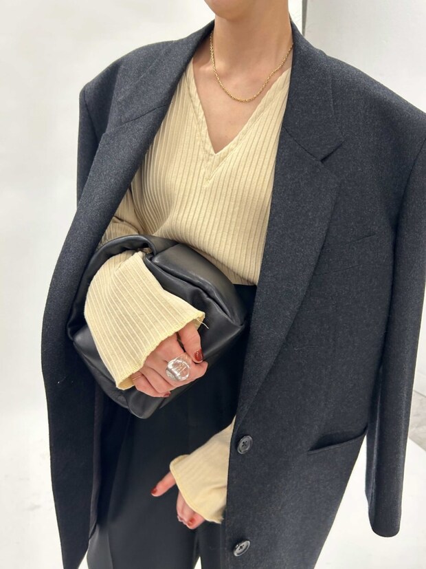 「ジャケット×パンツのシックでマニッシュなスタイルに、軽やかなベージュカラーのインナーを差して春を意識した着こなしに。今季はブラック×ベージュの配色がイチオシです。シンプルなコーディネートなので、立体的なバッグと大ぶりなクリアリングなど小物をアクセントにしました」