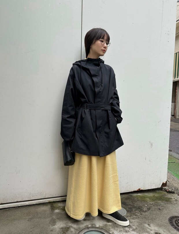 カジュアルなブルゾン×女性らしいドレスというテイストMIXスタイルに。「オーラリーのブルゾンはシルクも配合されていて、きれいめに着られるのでとてもお気に入り。シンプルなコーデですがイエローをきかせて華やかさもありつつラフにまとめました」