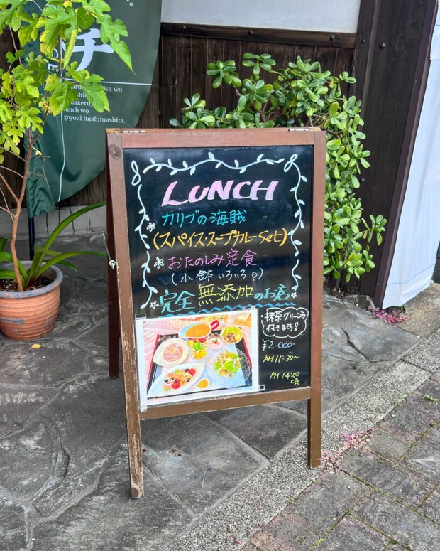 入り口のメニュースタンドを見ると、ランチは「カリブの海賊」という名前のスパイススープカレーセットと、いろいろな小鉢がついた「おたのしみ定食」の2種類あるようです。