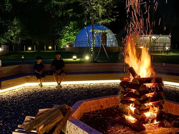 夜は満天の星空の下、キャンプファイヤーでゆったりとした時間を過ごそう。