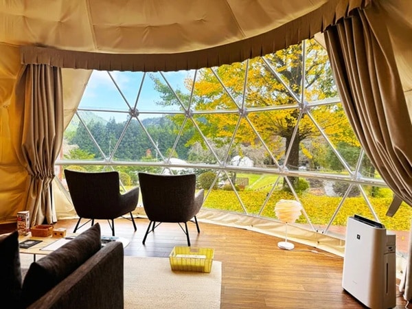 テント内から紅葉を眺めながら、手ぶらで快適にアウトドアを満喫できる。