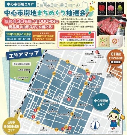 対象店舗で買い物をした人に抽選券を配布し、旧千歳館エリア(花小路)に設置された抽選会場で、山形牛や商品券など豪華景品が当たるガラポン抽選を行う。抽選は先着順。詳しい情報は、下記の詳細ページから確認を。