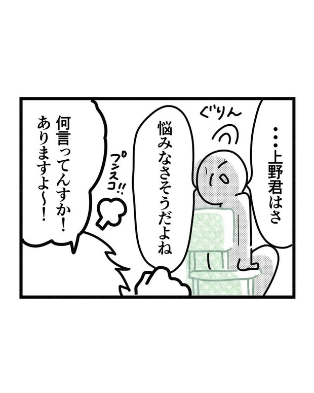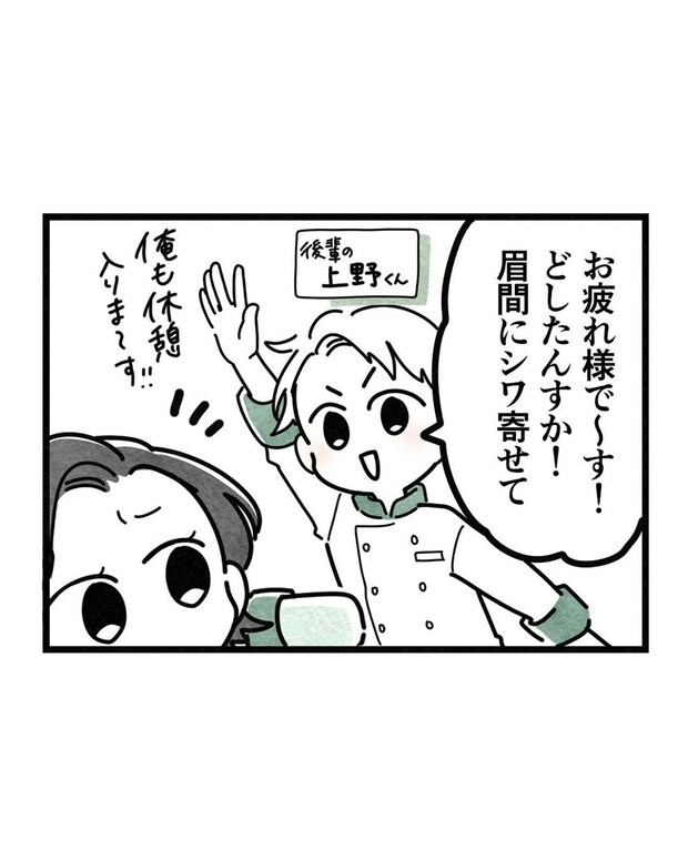 後輩の上野君に眉間にしわ寄っていると言われるさえさん。悩みすぎて顔に出てしまっていたようです。