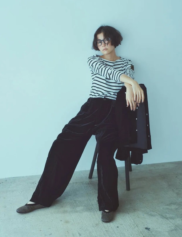 パンツ¥132,000、カットソー¥36,300、椅子に置いたシャツ¥143,000(全てマディソンブルー)、メガネ¥28,600(ウェイティング フォー ザ サン/リーンスプリング)、シューズはスタイリスト私物