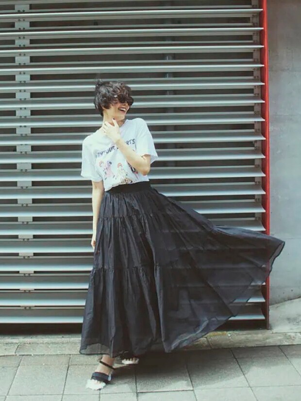 ロマンティックなボリュームスカートはTシャツでカジュアルダウン
