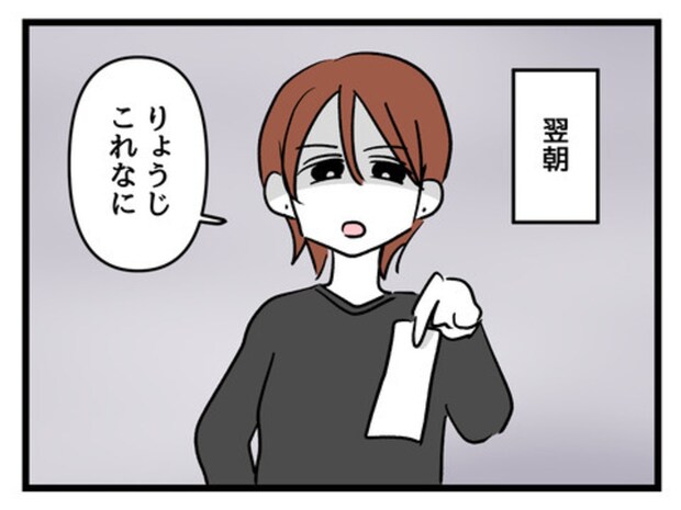 翌朝、レシートを持って仁王立ちするキリコさん。そのレシートは昨夜りょうじさんが行ったバーのレシートでした。発狂するキリコさん。そしてキリコさんは一緒にバーに行った相手は誰なのかりょうじさんに問い詰めます。