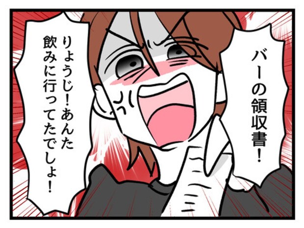 バーに行っていたレシートが見つかってしまいました。これを見たキリコさんは、りょうじさんは浮気している!!と発狂。