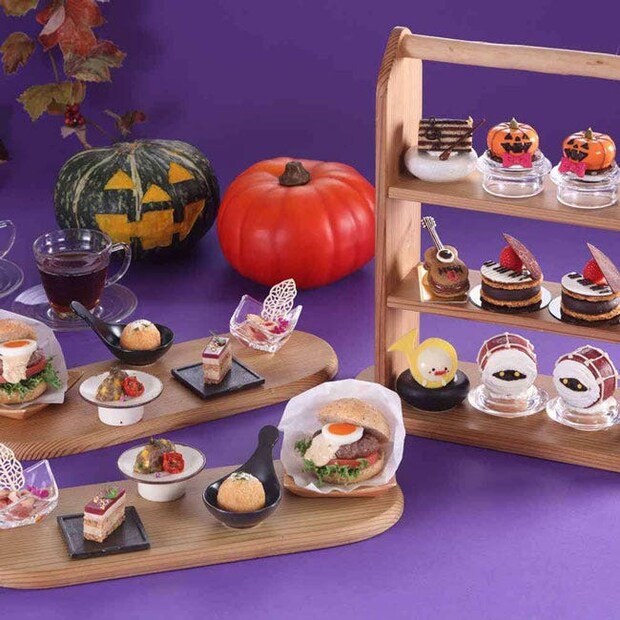 こちらは、シャインマスカットとマロンが主役のハロウィン仕立てで、焼きたてマロンパイやモンブラン×カシス、ゼリーやフィナンシェまで秋の味覚がぎゅっと集合。セイボリーは松茸のコンソメパイ包みやトリュフ風味ポテトなど香り高く、高級感あふれる品々をラインナップ。