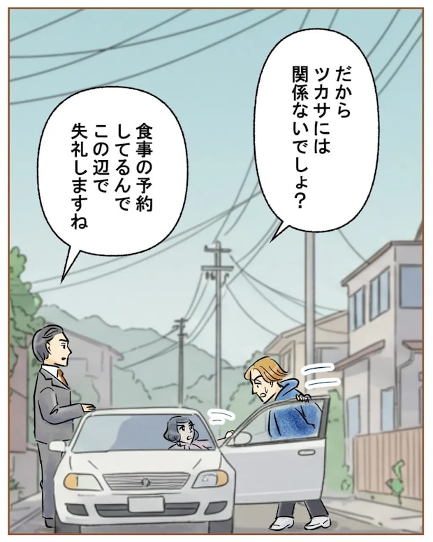 突然ナズナさんの実家にやって来たツカサさんに、何かあったのかとたずねるナズナさん。すると車から降りて来たキサラギさんに「え?誰その男?」と失礼な物言いのツカサさん。ナズナさんがたしなめると「初めまして」とキサラギさんがツカサさんににじり寄って挨拶を。その後、ナズナさんを車に乗せるキサラギさんを見て、「なんだよ?誰だよ?」と詰め寄るツカサさんに、「関係ないでしょ?」とナズナさんが静かに言いました。