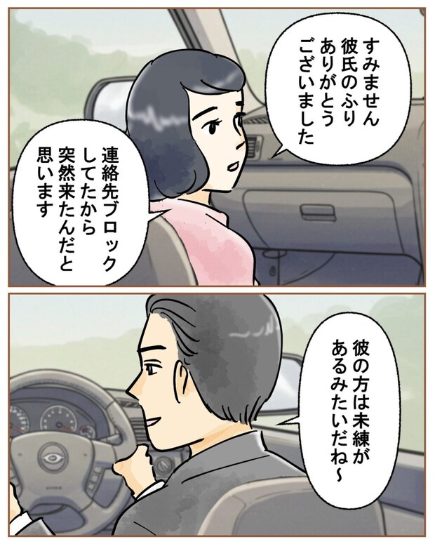その頃車内では、「すみません。彼氏のふりありがとうございました。連絡先ブロックしてたから、突然来たんだと思います」とナズナさんが言うと、「彼の方は未練があるみたいだね~」とキサラギさん。