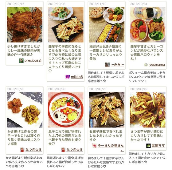つくれぽでは子どもや家族が喜んでくれたという声が届いていました。さつまいもの甘さと豚肉のジューシーな味わいがマッチしておいしそうですね。ぜひ、この時期にぴったりのから揚げを作ってみてください。(TEXT:若子みな美)