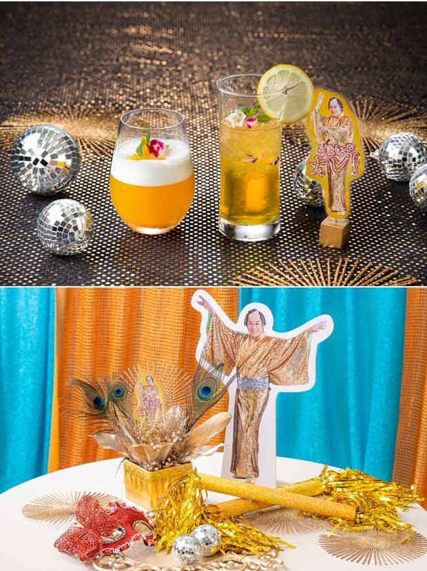 注目のオプションメニューもご紹介。マツケンオリジナルドリンクには、マンゴージュースをベースにオレンジジュースを加えた「愛のささやき トロピカルラブブーケ・オレ!」、ハイボールにエナジードリンクを加え、エディブルフラワーを添えた「飲み明かそう セニョリータ!ゴールデンハイボール」の2種類を用意。