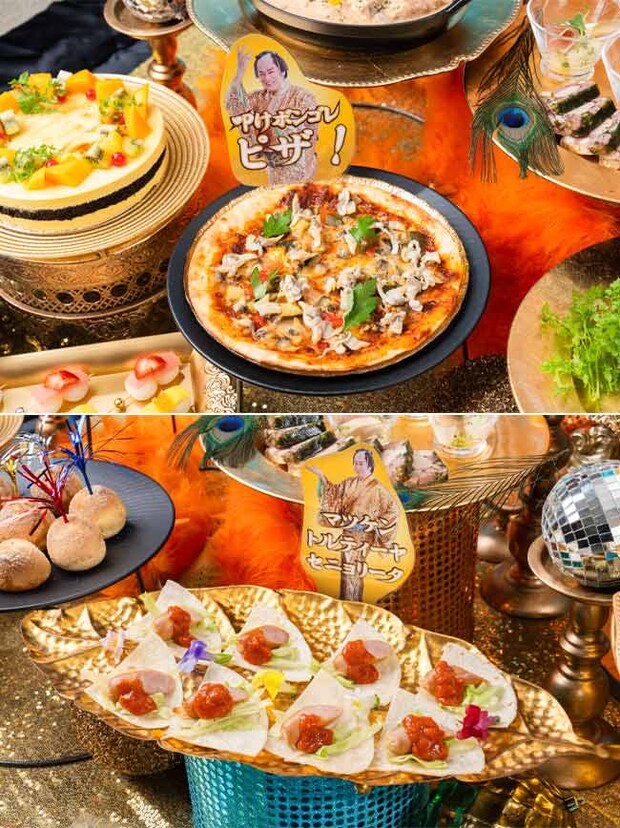 ブラジル料理以外にも、ホテルが誇る世界各国の料理をお届け。「叩け!ボンゴレピザ」や「マツケン トルティーヤ セニョリータ」など、「マツケンサンバ2」の世界観を彷彿とさせるメニューが並ぶのでお楽しみに。