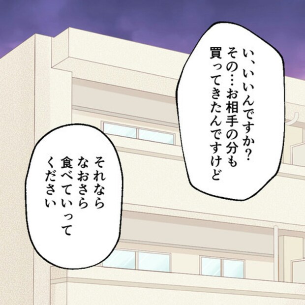 E原さんは、あの日のお礼を言うためにS葉さんに会いに来ました。彼が持ってきたお土産を見てうれしくなったS葉さんは、E原さんも一緒に食べようと部屋に誘いました。