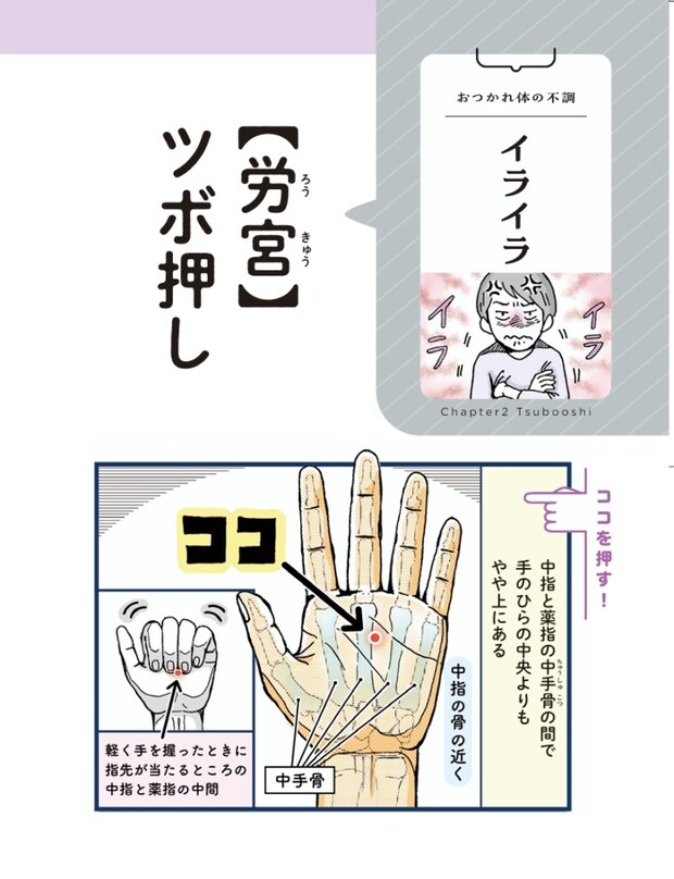 今回は『ピンポイントで整う!押し活』第2章「おつかれ体の不調 ツボ編」より、【イライラ】【怒り】に関する効果的な押し活をご紹介します。
