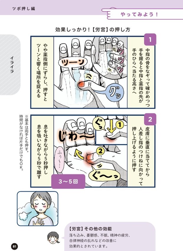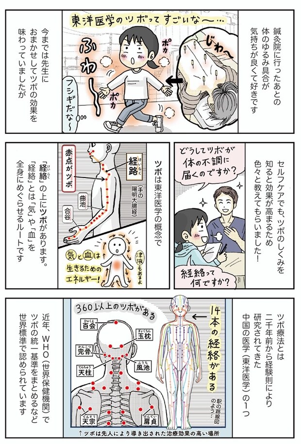 筆者の崎田さんが実際に鍼灸院で施術を受け、東洋医学のツボ療法の効果を実感したといいます。そこから、自分でできるツボ押しについて取材を行い、セルフケアをまとめたのが「ツボ編」です。