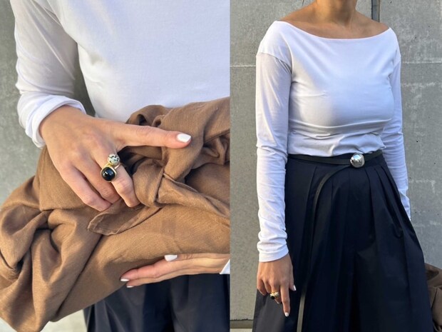 「ア ヴァケーションのシルバーモチーフの細いベルト、フリュイジョリのダルメシアンジャスパーとブラックオニキスのリングが、スタイリングに奥行きを出してくれます」ダルメシアンジャスパーリング¥14,300(フリュイジョリ)、ベルト¥24,200※1月22日発売(ア ヴァケーション × デミルクス ビームス/共にデミルクス ビームス 新宿)