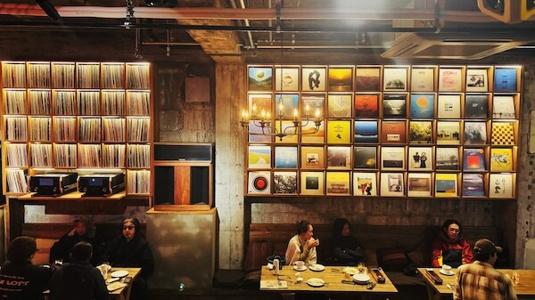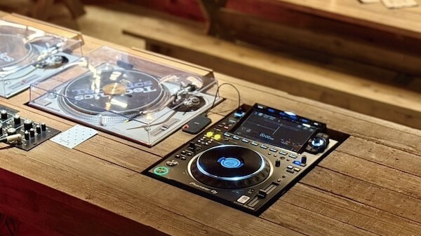 壁一面に並ぶレコードジャケットと、カウンターに備えられたDJブースが空間に個性と音楽の文化を与えている。