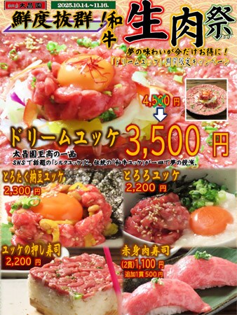 東京都台東区の焼肉店「焼肉上野太昌園 本店・別館」では、SNSでも話題の人気商品「ドリームユッケ」を対象に、10月14日(火)〜11月16日(日)の約一カ月間、期間限定の特別キャンペーン「生肉(なまにく)フェア」を実施する。
