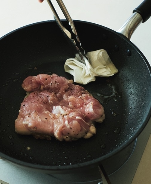 鶏肉から出てきた余分な脂は、ペーパータオルでのぞいて。臭みがおさえられ皮がパリパリに焼ける。