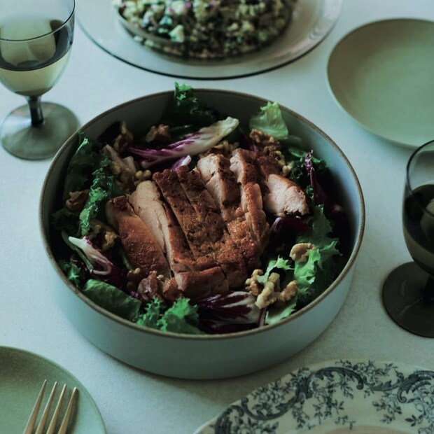 鶏肉は皮目をじっくり焼き、香ばしく仕上げると◎。ほろ苦いトレビスと口当たりのいいくるみも加え、大人味に。