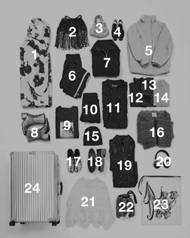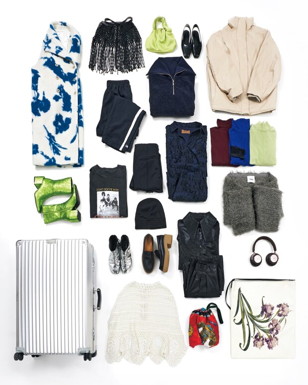 1_コート¥38,500(アメリ) 2_Chika Kisadaのビーズフリンジスカート 3_ PAPYRUSのシルクバッグ 4_THE ROWのフラットシューズ 5_フェイクレザージャケット¥38,500(アメリ) 6_adidasのヴィンテージパンツ 7_ハーフジップブルゾン¥19,250(アメリ) 8_ブーツ¥23,100(アメリ) 9_ロンT¥12,100※2024年4月発売予定(アメリ) 10_AMERIのパンツ 11_上から:ジャカードシャツ¥23,100、ジャカードスカート¥23,100(共にアメリ) 12_ZARAのタートルネックニット 13_タートルネックニット¥13,200(アメリ) 14_YOHEI OHNOのタートルネックカットソー 15_CHANELのビーニー 16_TANのニットボレロ 17_Maison Margielaのブーツ 18_ HERMÈSのローファー 19_上から:シャツ¥19,800、パンツ¥18,150(共にアメリ) 20_ Bang & Olufsenのヘッドフォン 21_クロシェのニットカラー¥22,000(アメリ/全てアメリヴィンテージ) 22_ヴィンテージのバッグ 23_DRIES VAN NOTENのバッグ 24_RIMOWAのスーツケース ※価格の記載がないものは全て私物