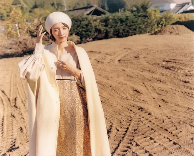 コート¥132,000、ドレス¥159,500(共にコズミックワンダー/センター・フォー・コズミックワンダー)、ベレー帽¥15,400(chisaki/MAISON ENKU)、左手人さし指のリング¥28,600、中指のリング¥27,500(共にボーニー/エドストローム オフィス)