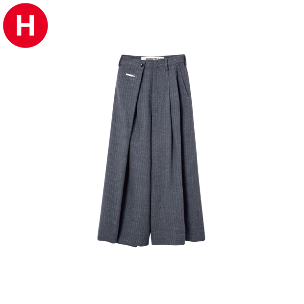 PRANK PROJECT タックパンツ フロントにアシンメトリーなタックを施した個性的なパンツ。はいたときのコクーンシルエットにも注目したい。Gのジャケットとのスーチングも可能。パンツ¥28,600(プランクプロジェクト/プランクプロジェクト 青山店)