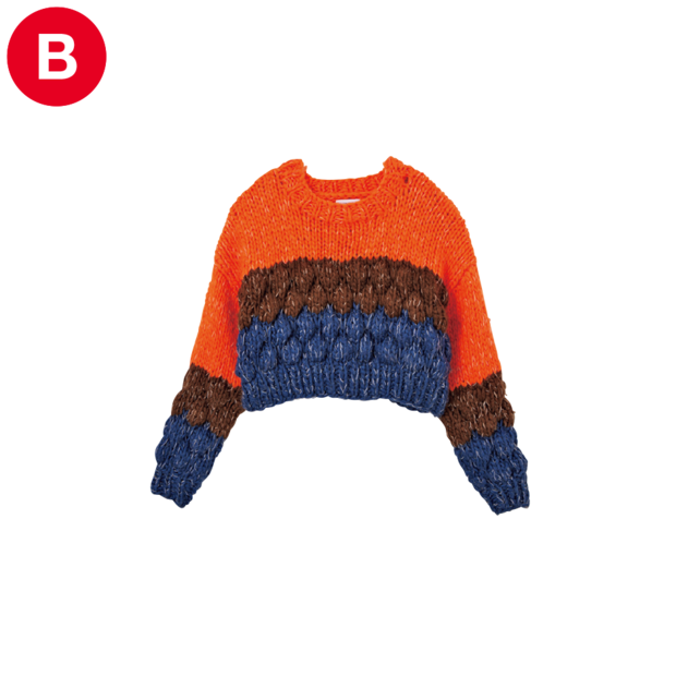 MAISON SPECIAL ローゲージニット ローゲージの手編みニットは、キャッチーなカラーリングがポイント。ボリューム感はあるものの、着丈が短めなのでバランスよく着られます。ニット¥27,500(メゾンスペシャル/メゾンスペシャル 青山店)