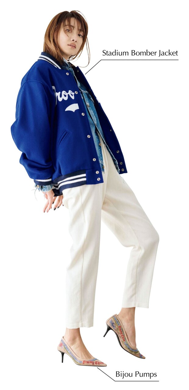 スタジャン¥107,800(セトルマイヤーズ/ロク シンジュク)、タートルネックニット¥20,900(イロット/ザ・ウォール ショールーム)、デニムジャケット¥74,800(マディソンブルー)、パンツ¥69,300(フォルテ フォルテ/コロネット)、シューズ¥260,700(ジミー チュウ)