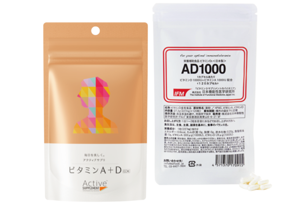 左から:1粒にビタミンAを5000IU、Dを400IU含有! アクティブサプリ ビタミンA+D 60粒 ¥3,240(プロティア・ジャパン)、サプリメントでは珍しくレチノールを採用し、β-カロテンをAに変換できない体質の人にも効果的な配合を実現。AD1000 120粒 ¥6,600(日本機能性医学研究所)