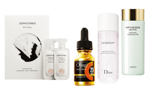 左から:シャープな輪郭を目指す発酵成分とWビタミン入り夜用マスク。ソフィスタンス リチュアル 10包 ¥9,900(ソフィスタンス)、高濃度&高浸透でC美容を牽引する存在! オバジC25セラム ネオ 12mL ¥11,000(オバジコール)、カプセルにビタミンEを閉じ込めてフレッシュなまま肌へ。C誘導体との相乗効果でクリア肌を実現。ディオール スノー エッセンス オブ ライト マイクロ ローション[医薬部外品] 175mL ¥8,250(パルファン・クリスチャン・ディオール) 、A~C、Eの力を集約した美白化粧水。アンフィネスホワイト クリスタル コンダクター [医薬部外品] 100mL ¥7,700(アルビオン)