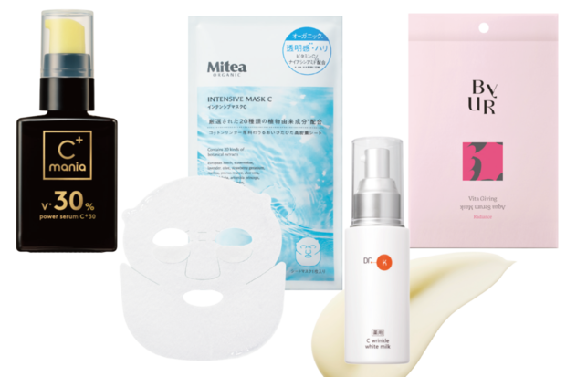 左から:2種のビタミンBとの掛け合わせで生まれた超ビタミンC+を30%配合。C+mania パワーセラムC+30 20mL ¥7,480(プレミアアンチエイジング)、抗酸化力に優れたスイカ幼果実エキスもIN。インテンシブマスクC 1枚 ¥352(ミティア オーガニック)、ナイアシンアミドを核にC、レチノールもプラス。薬用Cリンクルホワイトミルク [医薬部外品] 70mL ¥8,800(ドクターケイ)、従来品の倍のナイアシンアミドと2種のビタミンC誘導体を加えパワーアップ。バイユア ビタギビング アクアセラムマスク 1枚 ¥390(Hamee)