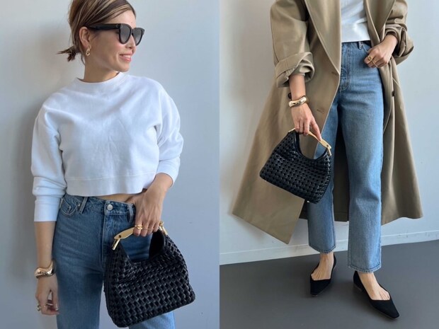 「羽織るだけで雰囲気の出るロヘのトレンチコートを主役に、インナーはクロップト丈の白スエットとタイトなブルーデニムを合わせてミニマルな印象にまとめてみました。その分、ブラックの小物やゴールドジュエリーをきかせてコーデを引き締めつつ、女性らしい華やかさをプラスしています」