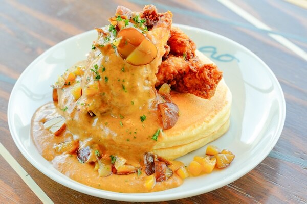 カフェでは秋冬メニューとして、ふんわりパンケーキにジューシーなフライドチキンをのせ、栗とマッシュルームのグレイビーソースを合わせた、秋らしいあまじょっぱい味わいが魅力の「バターミルクパンケーキ フライドチキン 栗とマッシュルームのグレイビーソース」1,680円(税込)や、