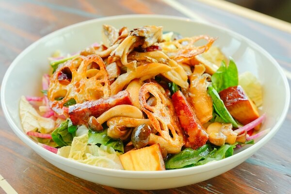 白馬サラミと香ばしくソテーしたキノコを、ゆず香る白菜サラダに合わせた一皿「白馬サラミとキノコのソテー、白菜サラダ ゆずのドレッシング」1,600円(税込)もラインナップ。