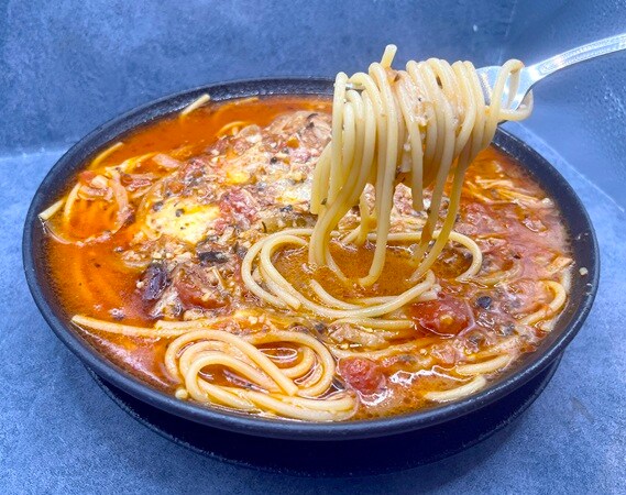 「背徳トマトとにんにく・ミートソーススープスパゲッティ」1,650円は、濃厚でコクのあるトマトベースのスープに丁寧に煮込まれたミートソースが溶け込み、トマトの甘みとにんにくの香りが食欲をそそる。