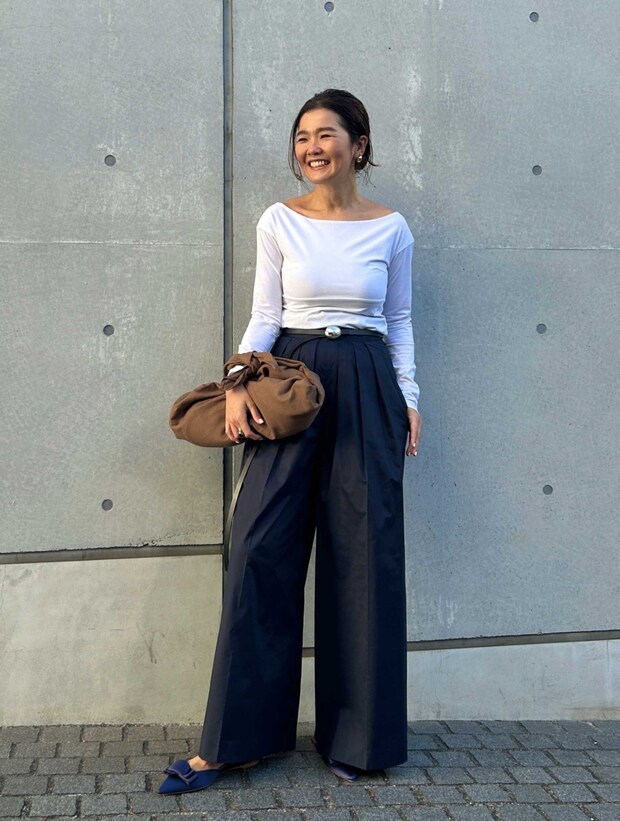 ホワイト×ネイビーのコンサバな色合わせを盛り上げてくれる小物使いに注目。「ア ヴァケーションのシルバーモチーフのベルト、フリュイジョリのダルメシアンジャスパーとブラックオニキスのリングが、スタイリングに奥行きを出してくれます」
