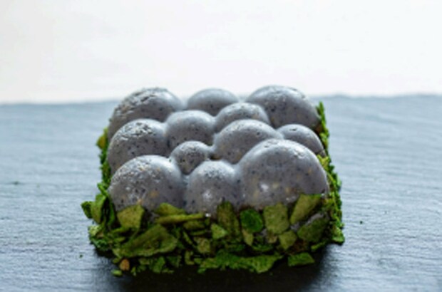 中層は、黒胡麻をたっぷり練り込んだティラミスクリームが、石畳の斑模様と質感を表現。胡麻の香ばしさと深いコク、なめらかな口どけでありながらも和の趣を感じさせる独創的な味わいだ。また、ティラミスクリームの中に福井県産六条大麦のパフを入れ、食感にアクセントを加えている。