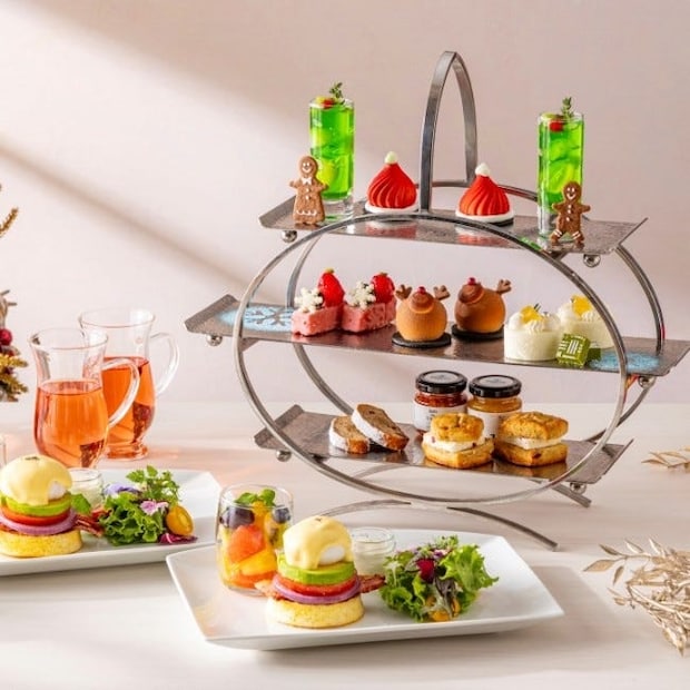 クリスマスをモチーフにしたホリデースイーツ8種類にスコーン1種類、さらには「エッグベネディクト」や「フラワーサラダ ランチドレッシング添え」、「フレッシュフルーツサラダ」など、モーニングにもぴったりなセイボリー3種類も。バリスタが淹れた香り高いコーヒーや、種類豊富に用意されたイギリスの高級紅茶と一緒に優雅なモーニングタイムはいかが。