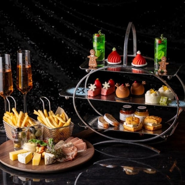洗練された雰囲気のバーで楽しめる大人のハイティーには、クリスマススイーツとスコーンのほか、お酒とも相性のよい「シャルキュトリー」、「チーズ」、「トリュフ風味のフライドポテト」などのセイボリーがたっぷりとラインナップ。アルコールドリンクの飲み放題プランや、オリジナルカクテルなど豊富なドリンクオプションもあるので、お酒とともにハイティーを楽しむのもおすすめ。また、毎週木・金・土曜日に開催されるジャズの生演奏もお楽しみに。