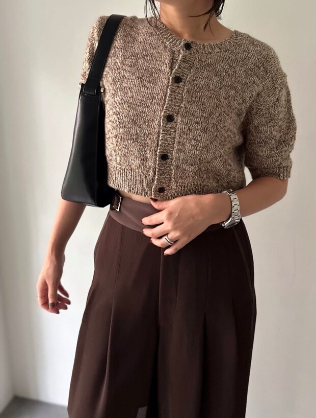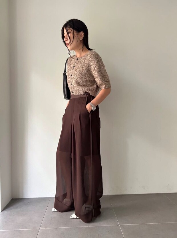 「まだ暑さの残る季節でも、秋の雰囲気を楽しめるコーディネートに仕上げました。メランジのニットはカーディガンのボタンを全留めしてトップスのように着るのが今季のポイント。半袖なので今からでも重宝します。ボトムはブラウンのシアーパンツをチョイス。透け感のある素材なので、まだまだ暑くても快適にすごすことができ、もう少し涼しくなってきたらロングブーツを合わせても素敵です。素材感の違うブラウン系のアイテムでスタイリングすることでヌケ感も出せます」