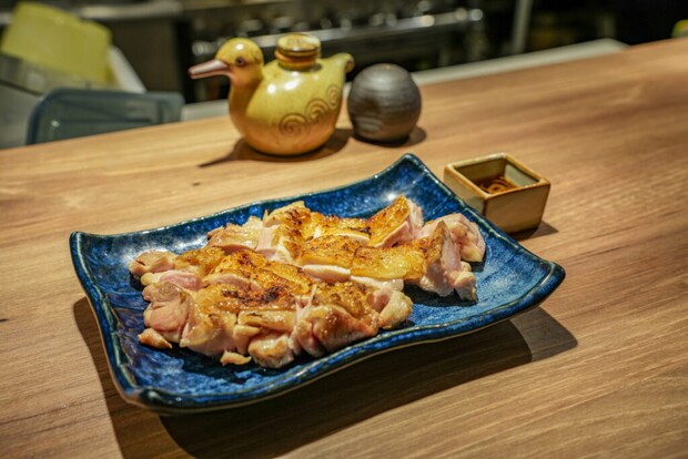 こちらは夜の人気メニュー「ももたたき」。お店で丸ごとさばいているからこそできる、パリッと焼かれた皮と、ぷりっとして柔らかなお肉が魅力の一皿です。ニンニクが効いた特製ダレとの相性も抜群!