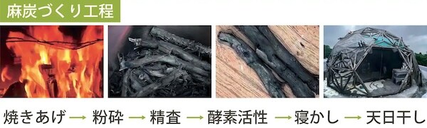 使用する麻の茎は、ダッチオーブンで800~900℃の高温焼成と熟成を経て炭にされる。これにより通常の炭より柔らかく仕上がり、サラサラとなめらかな口当たりが特長となっている。